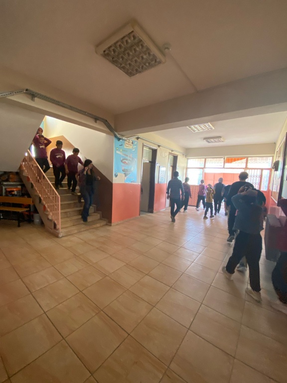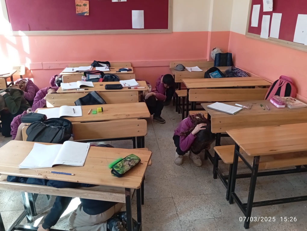 Okulumuzun tüm alanlarında çalan acil durum zil sesi ile “Çök, Kapan, Tutun” hareketi yapılarak zil sesinin bitmesi beklendi. Zil sesinin bitmesinin ardından yapılan duyuruyla öğrencilerimiz, öğretmenlerinin yönlendirmeleriyle tek sıra halinde bulundukları alanlardaki tahliye planını izleyerek, binayı terk edip toplanma alanlarına ulaştı.